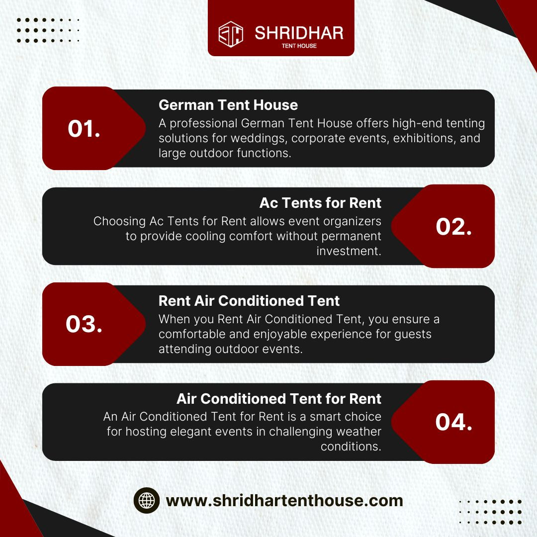 An Air Conditioned Tent for Rent is a smart choice for hosting elegant events in challenging weather conditions. These tents provide effective cooling, spacious interiors, and a refined look suitable for weddings, exhibitions, and high-profile functions. Rental options allow customization based on guest count and event style while ensuring proper insulation and airflow. With professional handling and reliable systems, these tents guarantee comfort and sophistication throughout the event. in Shridhar Tent House