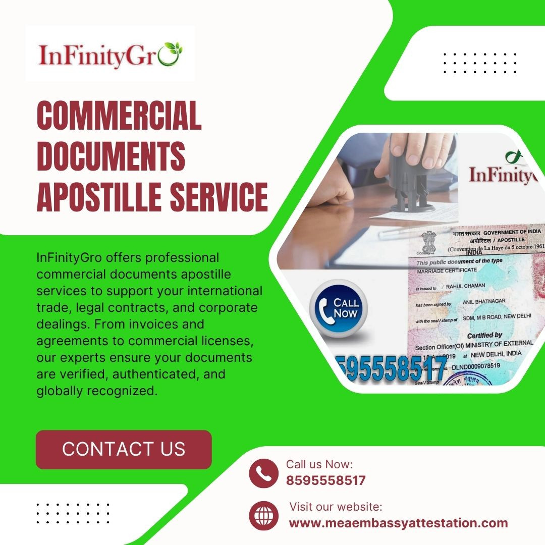InFinityGro offers professional commercial documents apostille services to support your international trade, legal contracts, and corporate dealings. From invoices and agreements to commercial licenses, our experts ensure your documents are verified, authenticated, and globally recognized. Our secure process guarantees compliance with international laws, making your business dealings abroad smoother. Choose InFinityGro for reliable, quick, and hassle-free commercial apostille services.