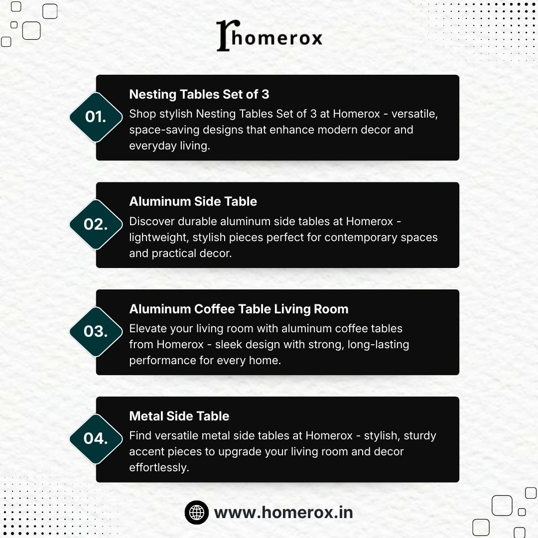 An aluminum coffee table for living room settings brings together strength, style, and modern craftsmanship. Designed to handle daily use, it provides a sturdy surface for décor, beverages, or entertaining guests. Its clean lines and premium finish enhance both minimalist and luxurious interiors. Ideal for homes seeking low-maintenance yet elegant furniture, this coffee table complements a wide range of seating styles. Discover refined living room solutions trusted by homeowners and crafted with care by Homerox.