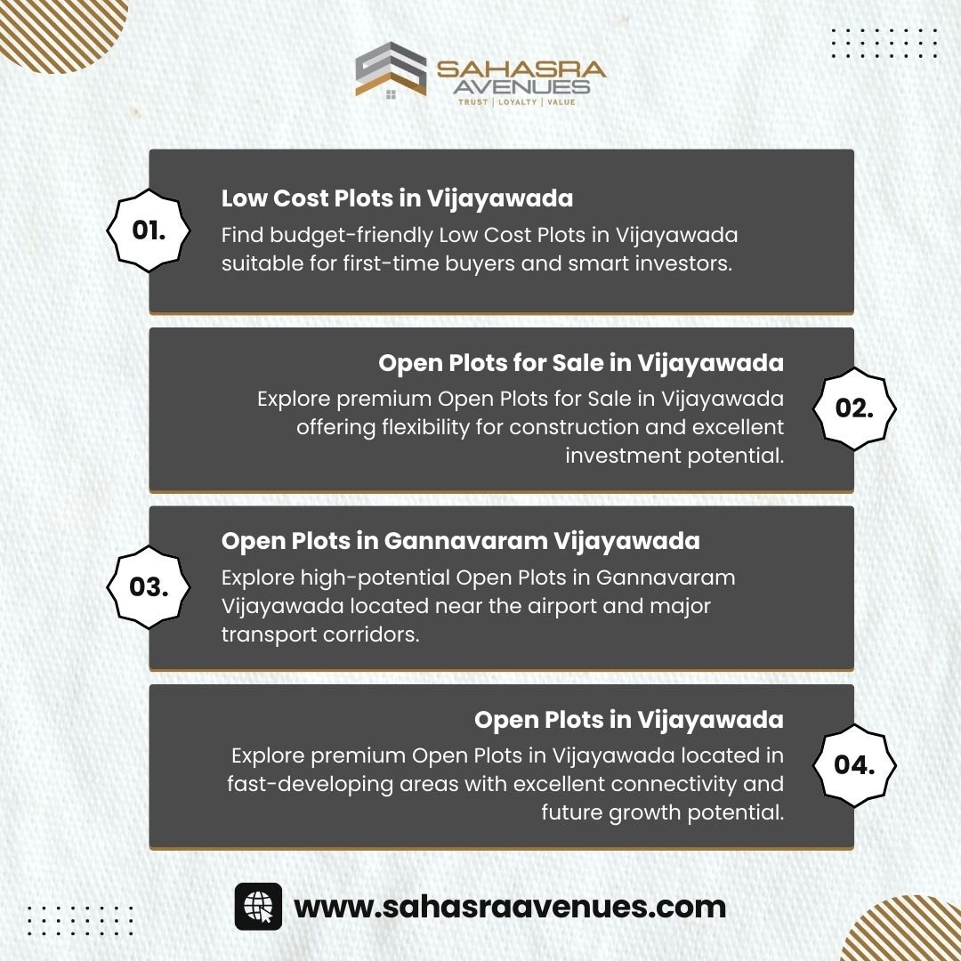Find budget-friendly Low Cost Plots in Vijayawada suitable for first-time buyers and smart investors. These plots offer great connectivity, clear titles, and promising growth potential in developing localities. Ideal for residential use or future resale, they combine affordability with long-term value. With verified listings, transparent pricing, and professional support, Sahasra Avenues helps you secure the right plot without compromising on trust or quality.