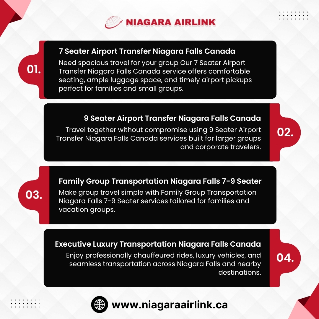 Make group travel simple with Family Group Transportation Niagara Falls 7-9 Seater services tailored for families and vacation groups. Enjoy roomy vehicles, safe driving, and reliable scheduling for airport transfers, sightseeing, or special occasions. Skip multiple taxis and travel together comfortably with affordable, convenient booking options. Experience smooth and memorable transportation solutions delivered professionally by Niagara Airlink.