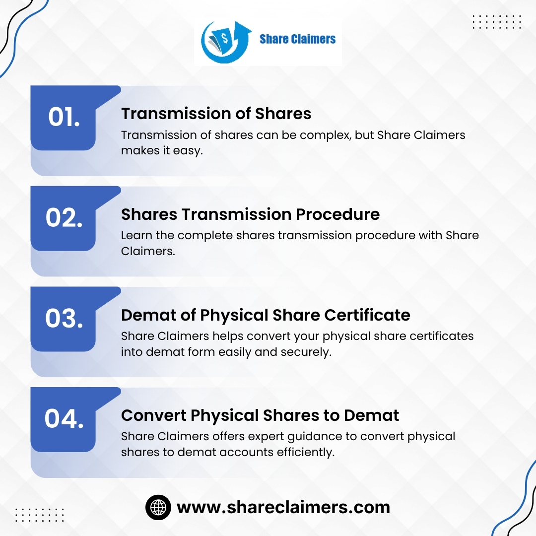 Transmission of shares can be complex, but Share Claimers makes it easy. We assist shareholders with all legal requirements, documentation, and processing to ensure timely transfer of shares to rightful owners. Trust our team for accurate, reliable, and professional share transmission services with minimal delays and maximum efficiency.